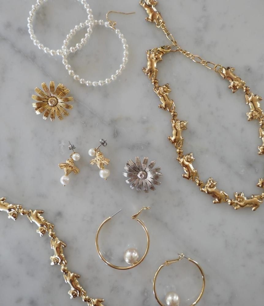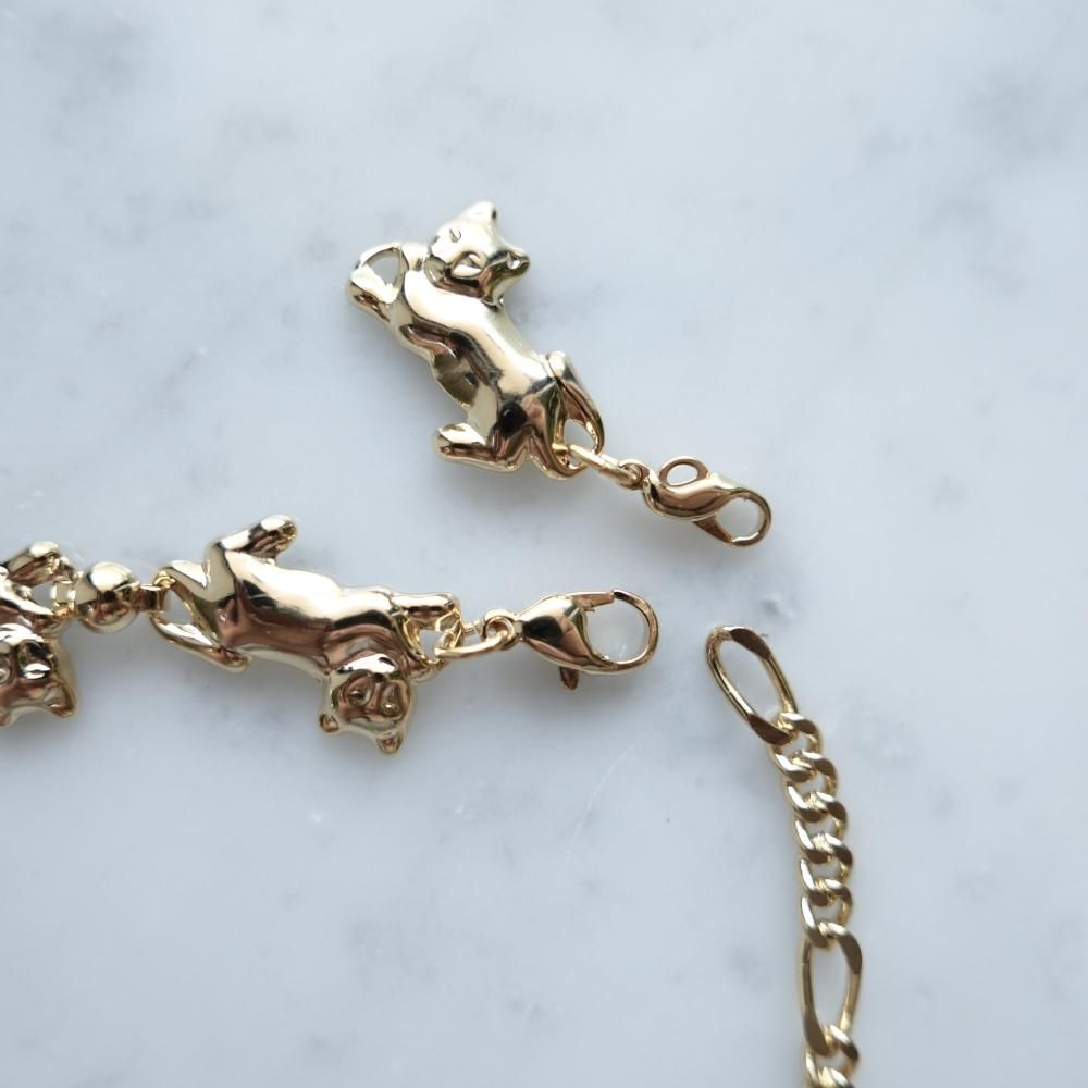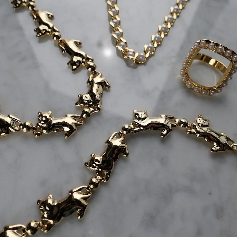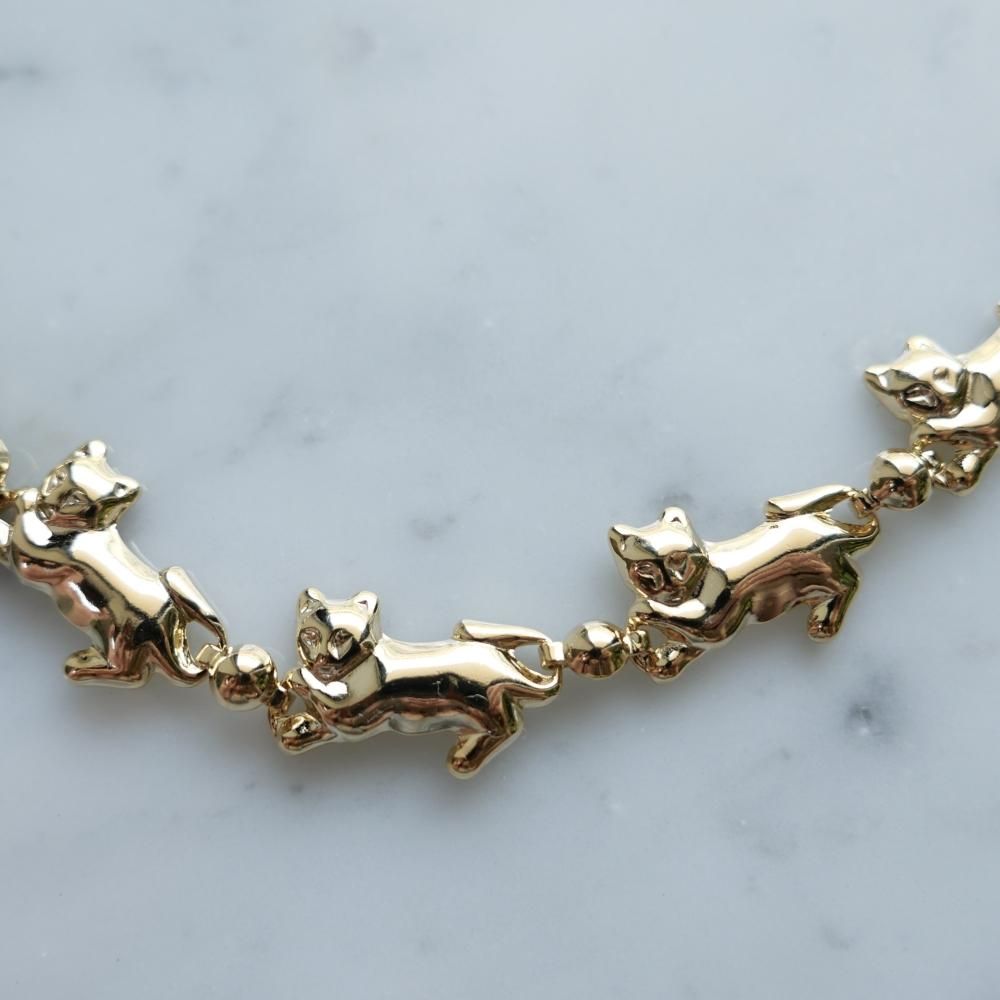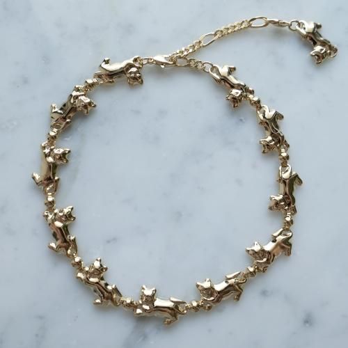 猫がボール遊びをしている様子が連なった遊び心のあるデザインのチョーカーは、首元にピッタリとフィットするレングスが旬の雰囲気。
